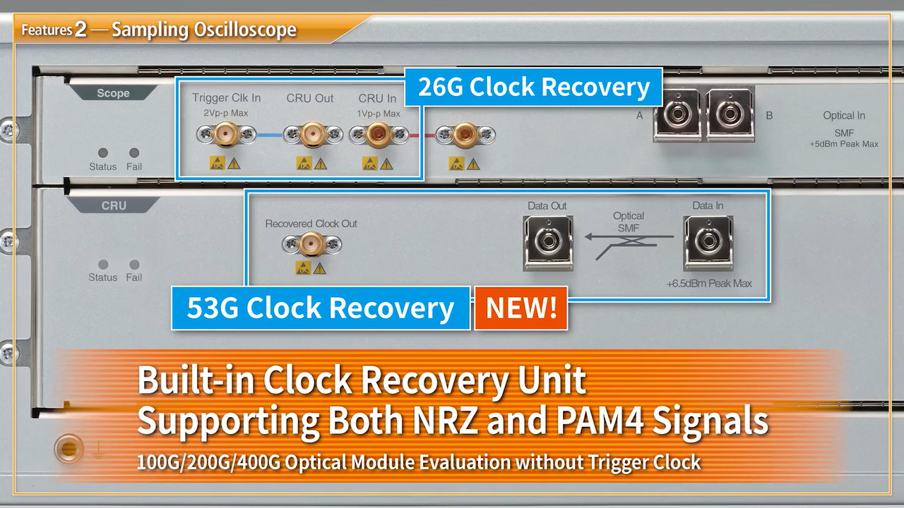 With 4 channels and a built-in sampling oscilloscope, the all-in-one MP2110A is ideal for evaluating optical modules and devices for 10 Gbit/s and faster networks.
