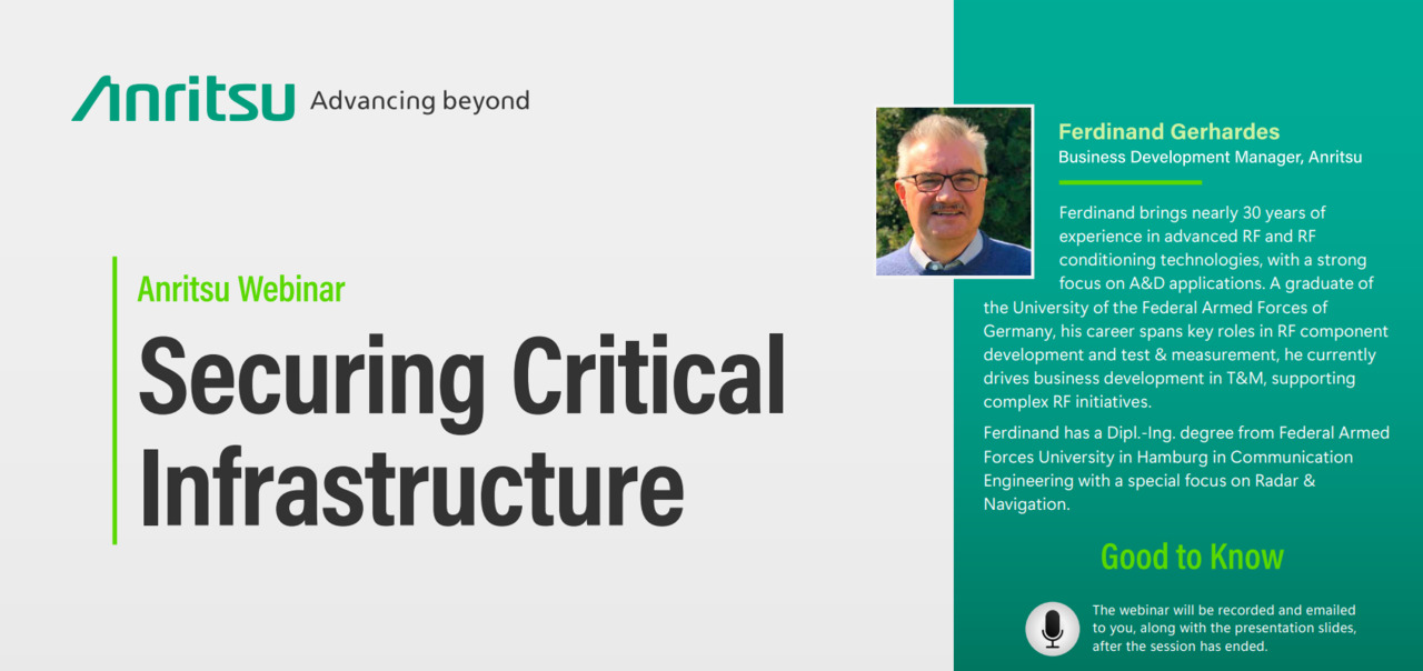Explore the increasing threats of GNSS jamming and spoofing on critical military, civilian, and commercial applications reliant on GPS and other satellite systems. In this webinar, we will discuss the vulnerability of GNSS signals, the real-world impact of jamming incidents and demonstrate how advanced spectrum analysers (Anritsu MS27201A, MS2090A) paired with MX280001A VISION software provide powerful tools for real-time detection, localization, and characterization of jamming and spoofing signals. Learn how controlled jamming tests using vector signal generators help evaluate and harden GNSS receiver performance, ensuring resilient Positioning, Navigation, and Timing (PNT) solutions essential for mission-critical environments. Topics covered will include: • Understand the characteristics and categories of GNSS jamming and spoofing threats • Learn how to detect and localize interference signals using advanced spectrum analysis tools • Discover techniques for controlled GNSS jamming tests to validate receiver robustness • Explore real-world applications and strategies for safeguarding critical PNT systems in Aerospace & Defense