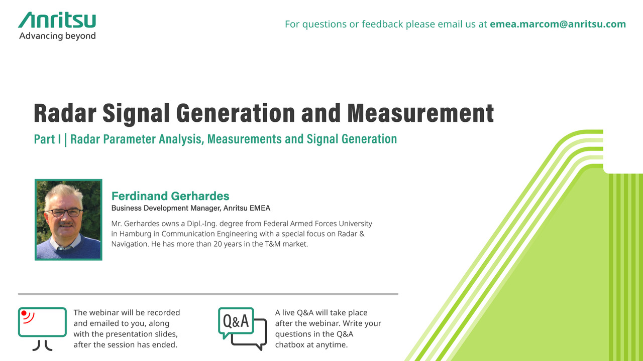 The webinar explains approaches on how pulsed signals can be measured in the time and frequency domain including the recording of baseband data (IQ data) using various options and hardware. It includes a short review of the measurement fundamental, the basics of radar and of signals as well as demonstrating measurement methods that show typical signals from the areas of air traffic, industrial and automotive radar.