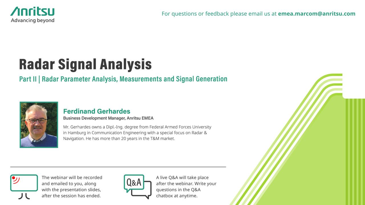 The webinar is dedicated exclusively to the further processing of recorded IQ data using typical Anritsu software applications as well as third-party companies. The process cycle of recording, post-processing, and analysis as well as re-broadcast is presented. It concludes with an introduction to the topic Pulse Descriptor Word feature for the generation of arbitrary waveform modulation and phase coherent switching. For radar operational test or demanding electronic warfare (EW) environments with high pulse density, it is requested to stream signal data. The use of IQ data always requires large data amounts and is limited in flexibility. A pulse descriptor word (PDW), which contains the feature values of the radar signal allows for very flexible and long-time record length streaming via LAN interfaces.
